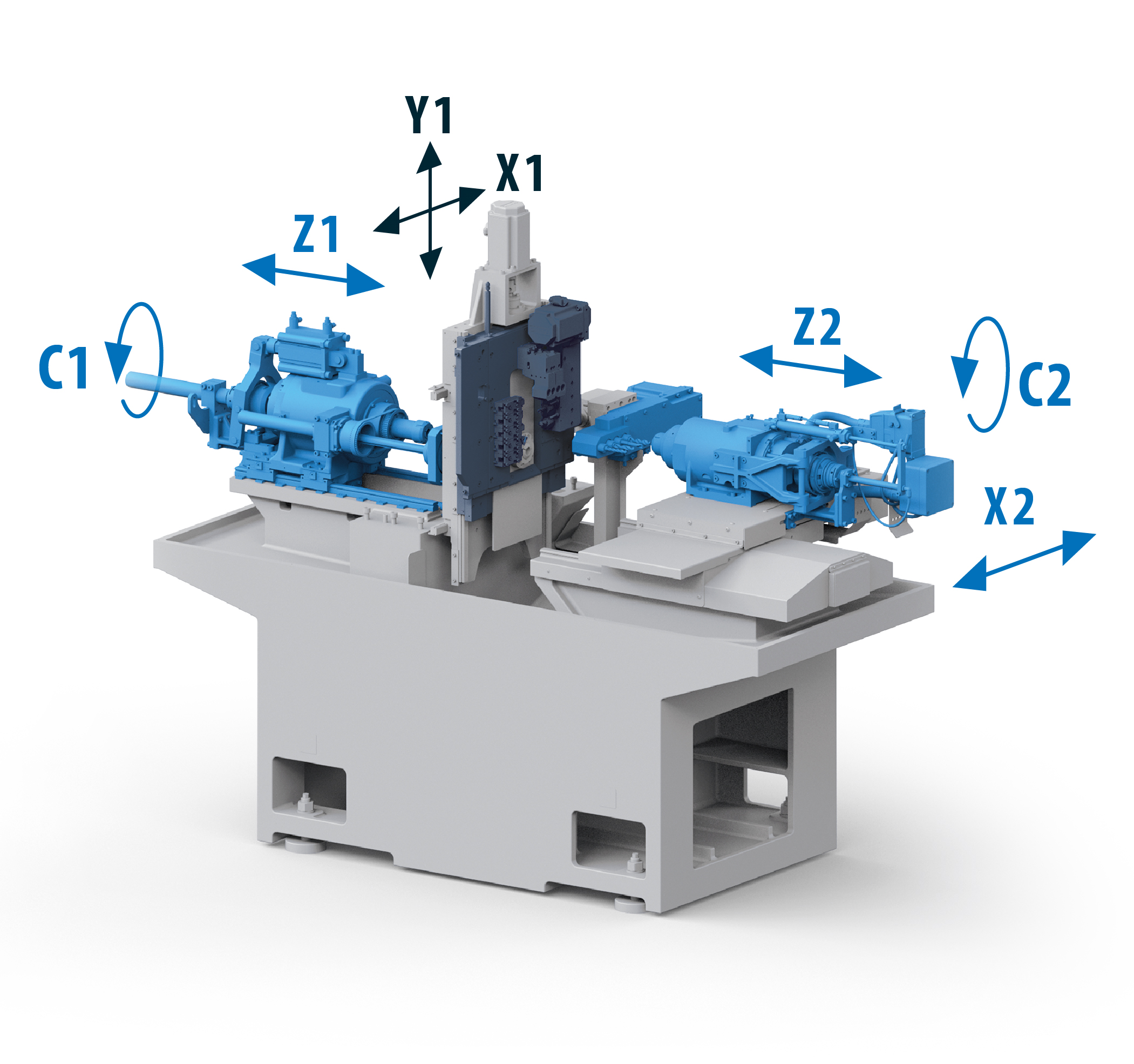 Stroj je standardně vybaven dvěma elektrovřeteny s maximálními otáčkami 12 000 ot/min a rotačním vodicím pouzdrem synchronizovaným pomocí kladek a řemenů s hlavním vřetenem. Pět lineárních CNC os (X1, Y1, Z1, X2, Z2) a dvě rotační osy (C1, C2).