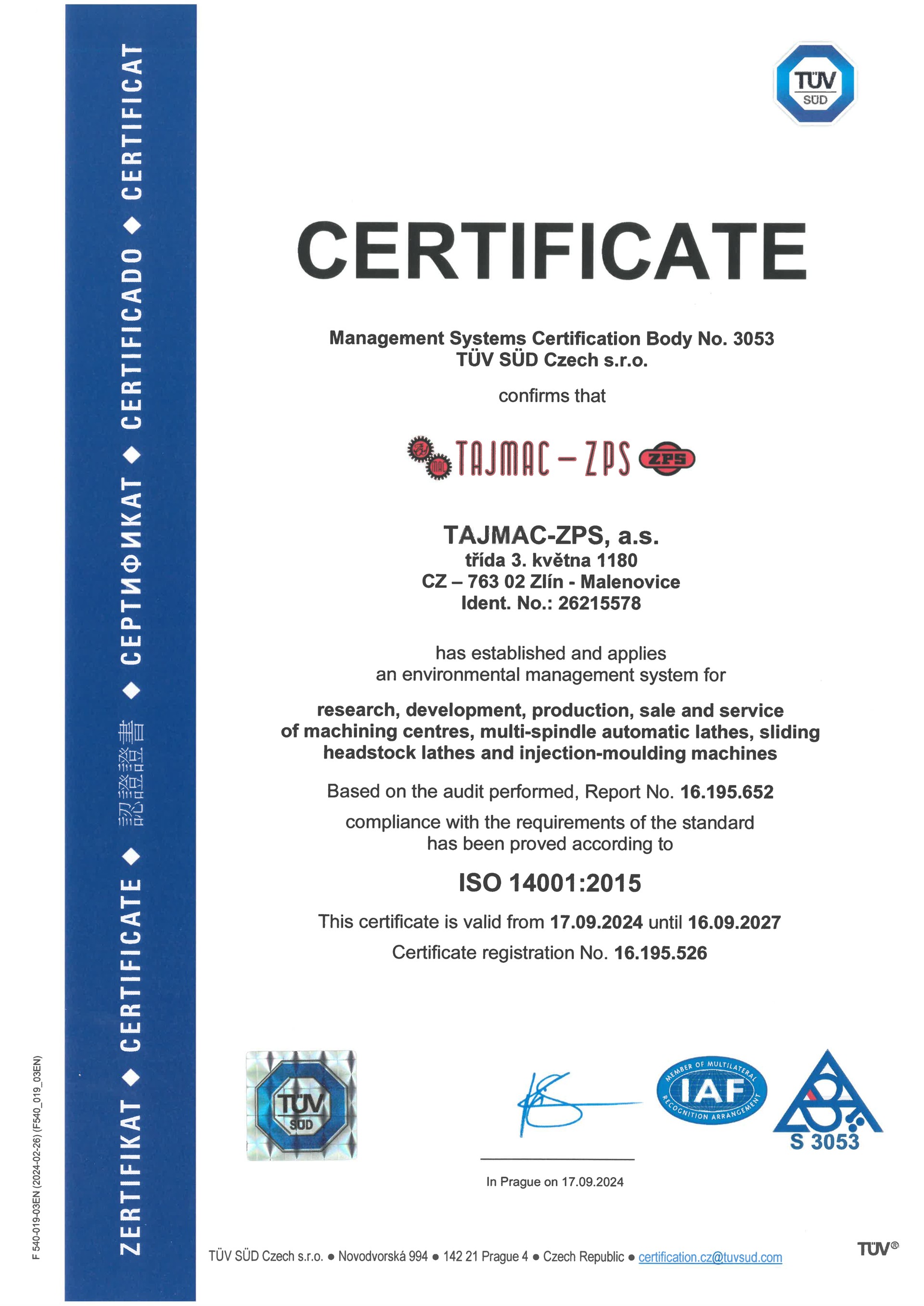 The certification company TÜV SÜD Czech s.r.o. conducted a certification audit of the quality management system (QMS) in 2010 and a certification audit of the environmental management system (EMS) in TAJMAC-ZPS, a.s. in 2024 regarding the activities of development, production, sales and service provision.